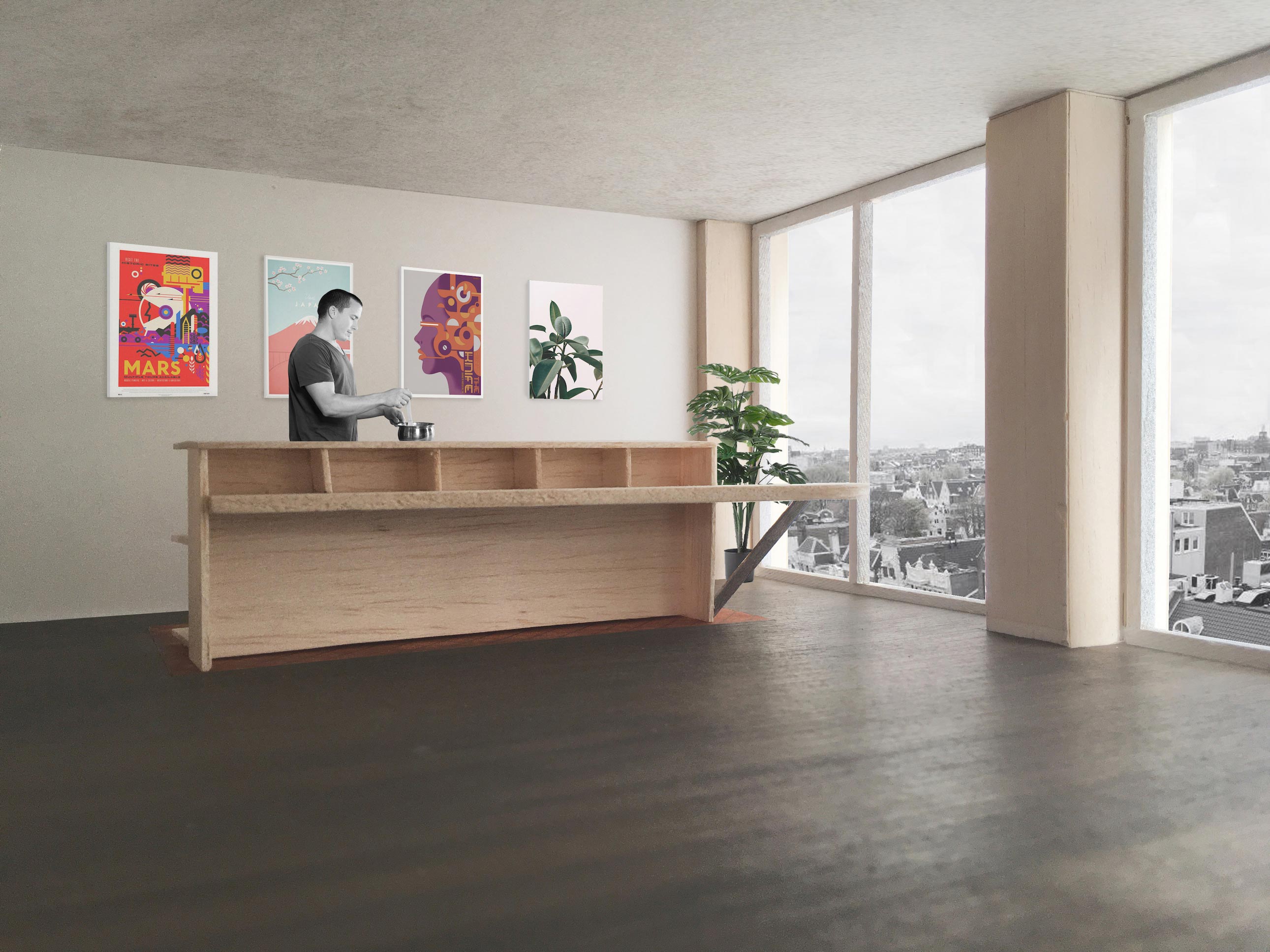 His loft is ontworpen in het Top-Up gebouw in Amsterdam-Noord. Het prachtige casco, gebouwd volgens het ‘’open building’’ principe, riep meteen een specifieke sfeer op. De eenvoud van de materialen - massieve houten kolommen met daarop betonnen platen - en de glazen gevel brachten het sterke ruimtelijke concept van de loft naar voren.