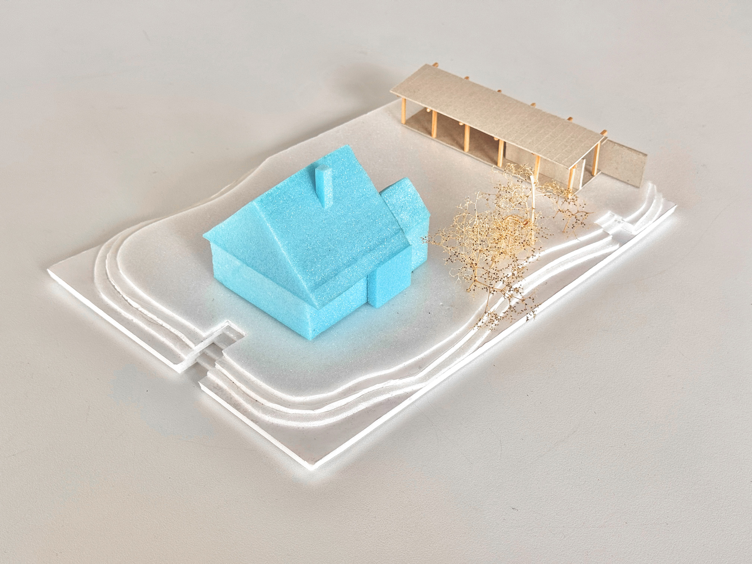 Het schuine dak zorgt ervoor dat de tuinstudio zich bescheiden voegt in de tuin en het zicht op het vakantiehuis open blijft. Tegelijkertijd laat de opgetilde dakrand het daglicht diep binnenvallen, waardoor het dak lijkt te zweven en de ruimte verrassend licht en ruimtelijk aanvoelt.